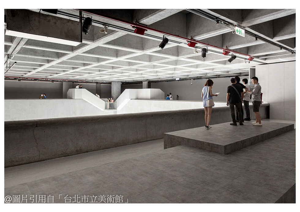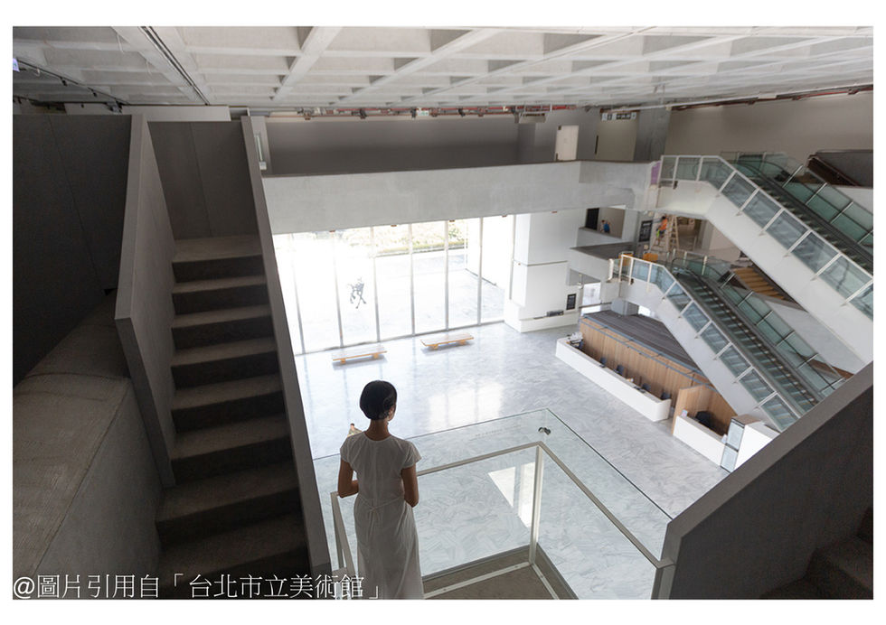 在這裡,賴志盛並未創造所謂的作品;取而代之的,是建造一條跨越的路徑,邀請觀眾或踮腳或跨越至欄杆之外觀看,在不同的位置與視角去經歷這一方美術館風景;進而對於習以為常的廊道,產生嶄新的感受。觀眾站在突出懸台上,在觀看時同時也被觀看;或碰觸到實體的天花板及女兒牆,或探進「池」內的虛空間,和從一樓直通三樓散射的光與流動的空氣對話,共同形成了作品。